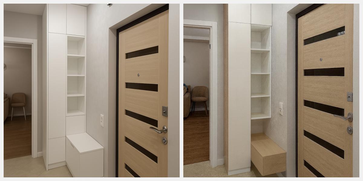 Чтобы клиенту было проще представить будущий интерьер, мы использовали ИИ-инструменты для визуализации. Фото, сделанные во время замеров, совмещались с нашими эскизами и объёмными моделями. Такой подход позволил ещё на этапе проектирования увидеть прихожую максимально приближённой к реальности и быстрее принять финальные решения по дизайну.
