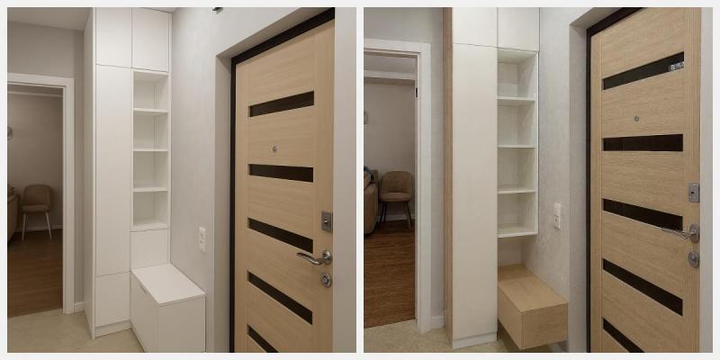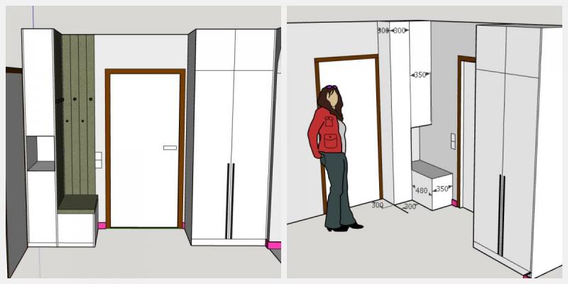 После замера мы перешли к этапу эскизного проектирования. Вместе с клиентом рассматривали несколько концепций прихожей. В том числе обсуждали вариант с мягкими панелями, экспериментировали с разными форматами пенала и стеллажа, подбирали оптимальный баланс между закрытым хранением и открытыми полками.