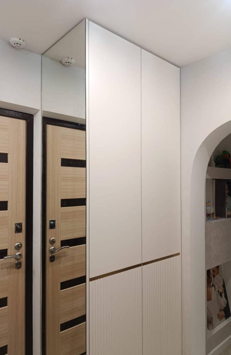 Cветлая прихожая с фрезерованными фасадами и акцентом из розового золота