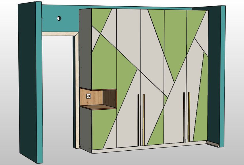 Этот шкаф был создан нашей компанией по индивидуальному заказу для спальни, где важны не только вместительность и удобство, но и атмосфера. Главная идея проекта — соединить форму и цвет таким образом, чтобы мебель стала акцентом, визуально расширила пространство и при этом не перегружала комнату. Именно поэтому мы выбрали геометрический рисунок, который плавно переходит с одного фасада на другой, создавая эффект цельной композиции, а не набора отдельных дверей.