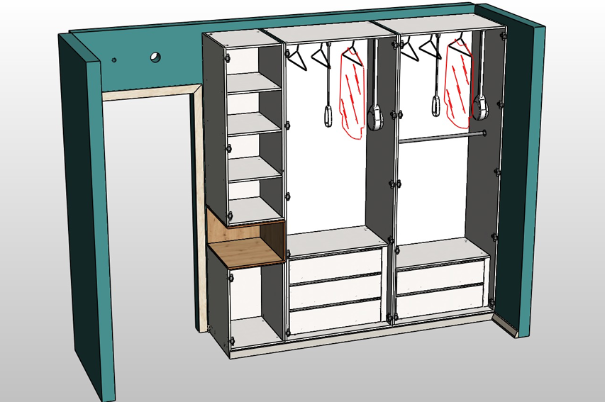 Одна из задач в проекте заключалась в том, чтобы при установке шкафа не перекрыть выключатель света. Часто подобные нюансы становятся проблемой на финальной стадии монтажа, но мы предусмотрели всё заранее.