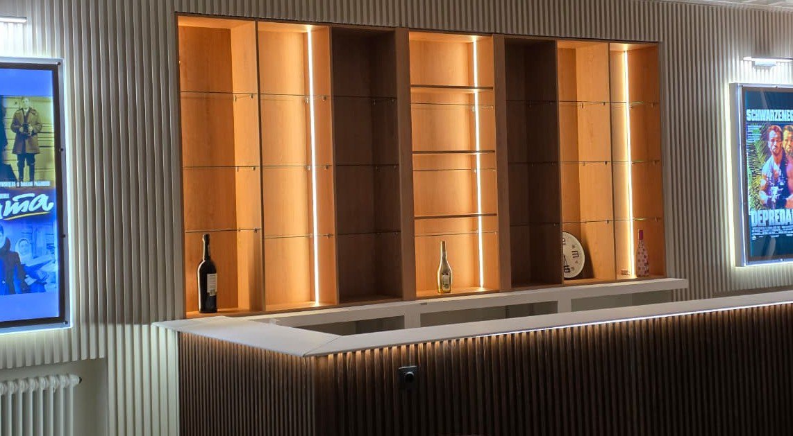 Именно с таким настроением мы работали над проектом стеллажей за барной стойкой в домашнем кинотеатре — пространством, где встречаются комфорт, стиль и личные истории.