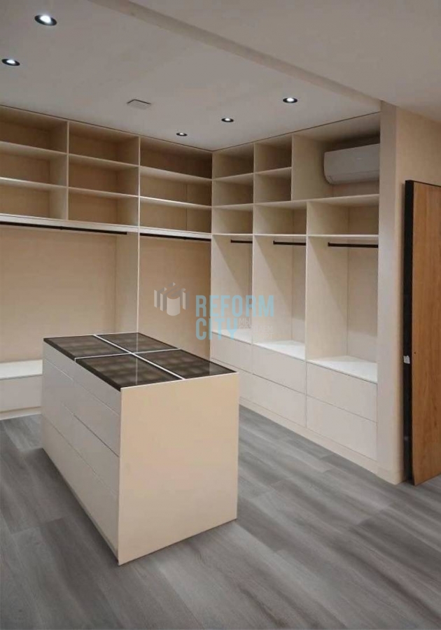 В этом проекте мы работали с пространством, где важна не только вместимость, но и сценарий использования. Распределение высоких шкафов по стенам как будто мягко обнимает пространство, превращая каждый сантиметр в продуманную систему хранения.