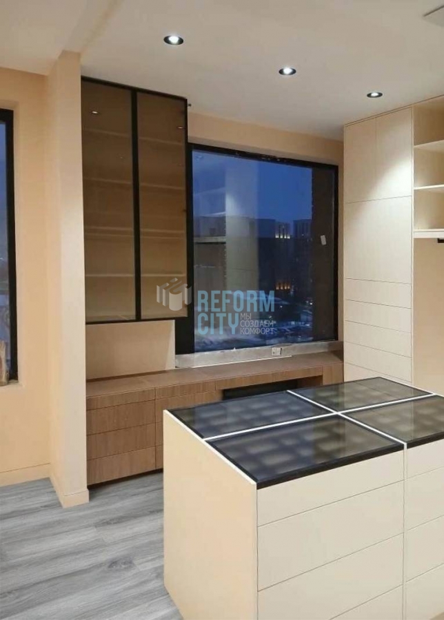 В центре композиции — функциональный остров с выдвижными ящиками и стеклянной столешницей.