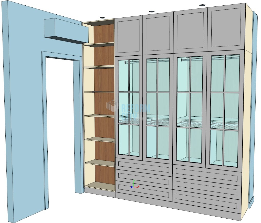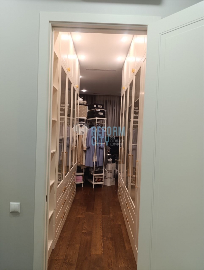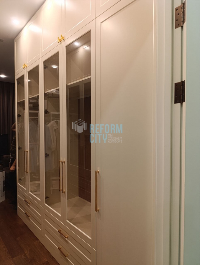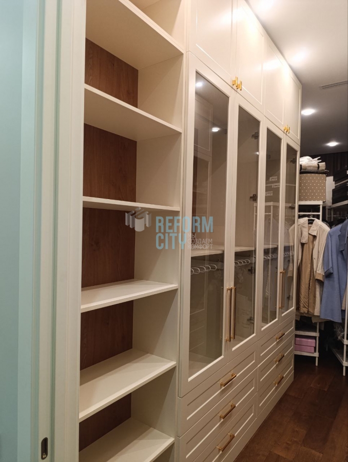 Гардеробная комната со шкафами по двум сторонам помещения. Гардеробные шкафы закрыты фасадами со стеклянными дверцами и глухими. Дверцы декорирован золотистыми ручками-кнопками.