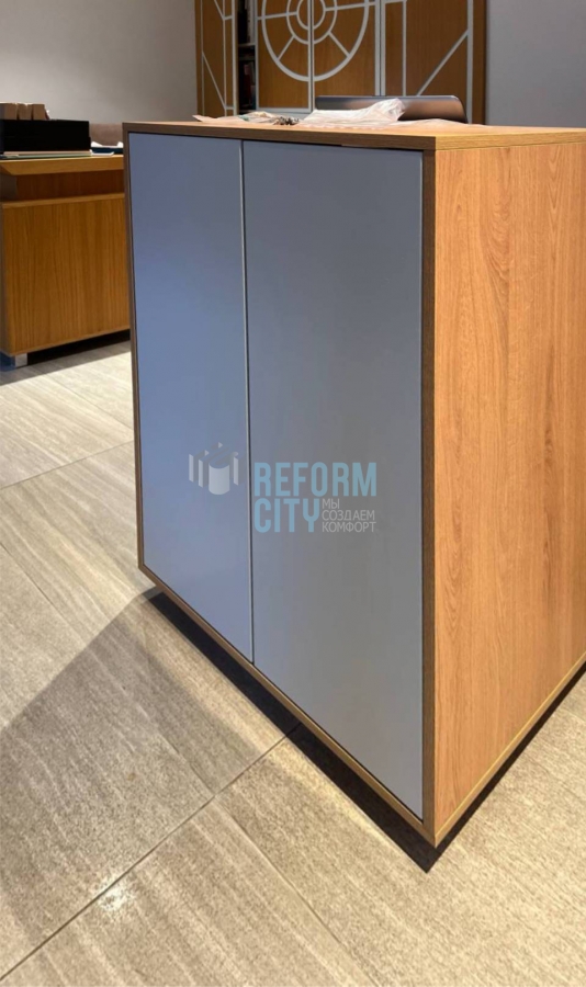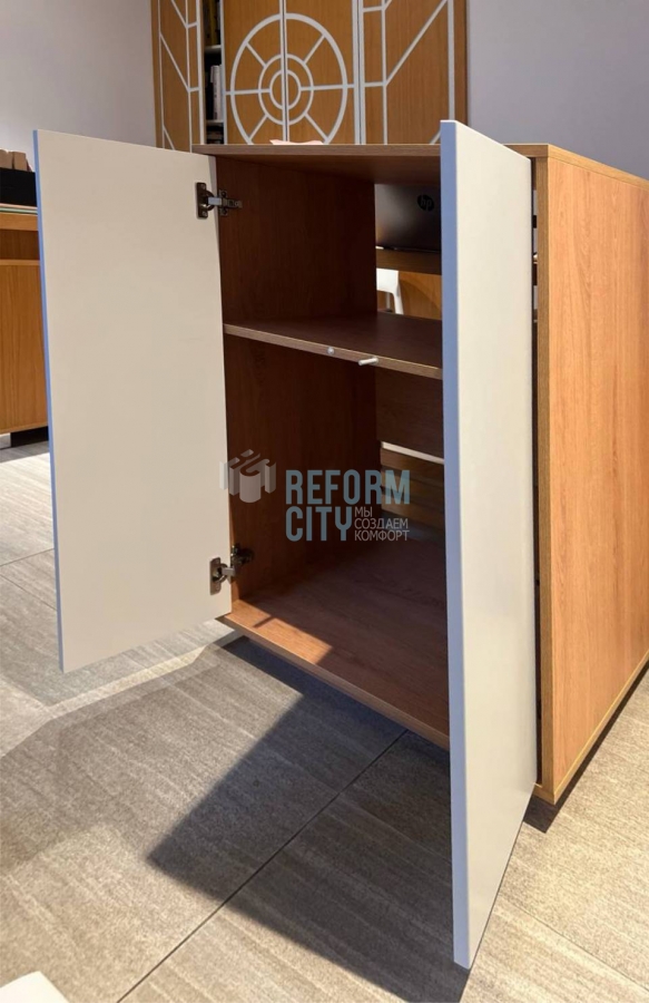 Офисная тумба с лаконичным дизайном. Фасады гладкие, светлые, без ручек. Открывание от нажатия.