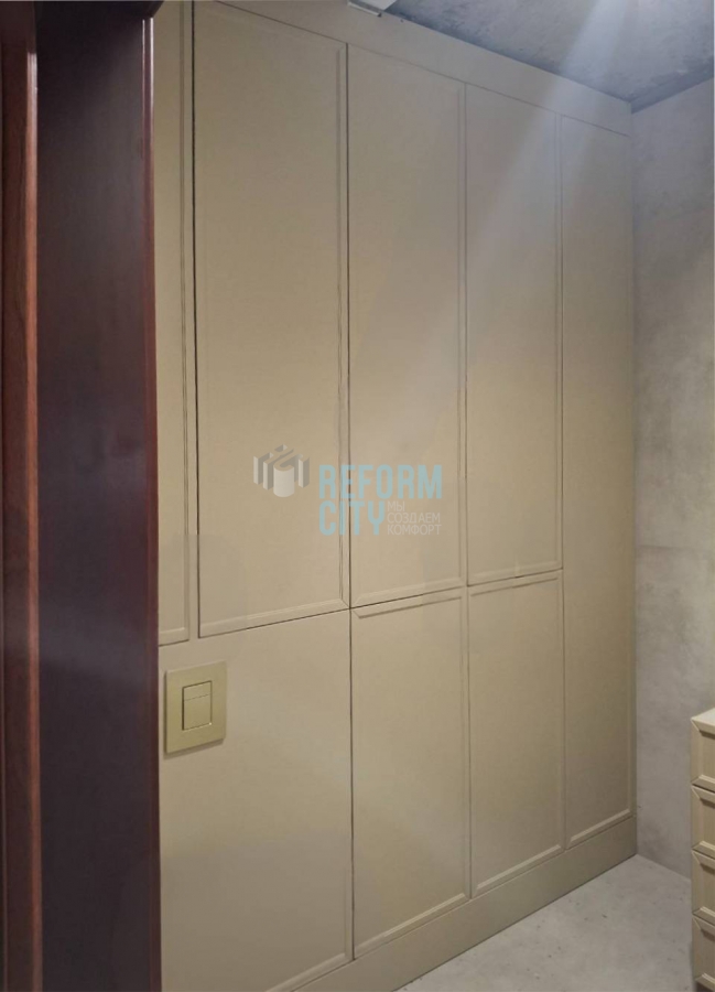 Внутри большого шкафа предусмотрено удобное хранение для всего, что обычно хочется спрятать с глаз. Бытовая химия, текстиль, запасы и мелочи находятся под рукой, но не на виду. Конструкция продумана с учетом влажной среды, используются материалы и фурнитура, рассчитанные на эксплуатацию в ванной комнате.