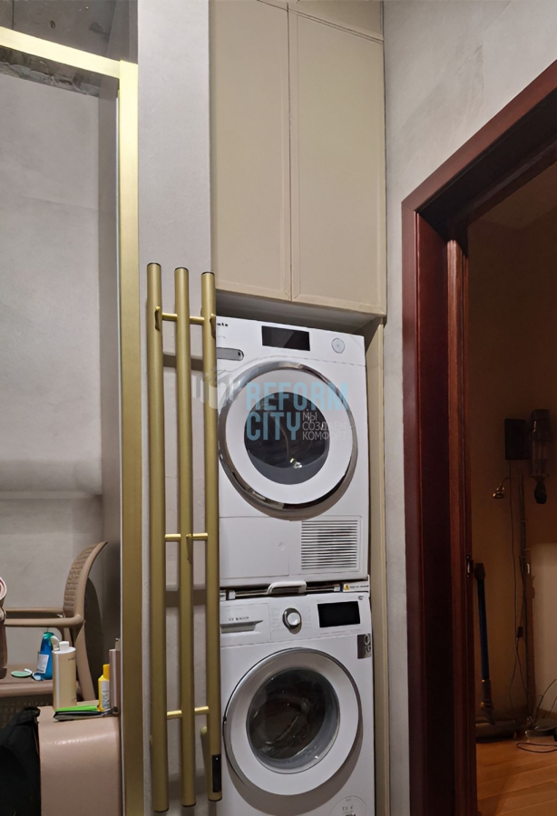 Во втором шкафу размещены стиральная и сушильная машины. Техника аккуратно интегрирована в мебель и не выбивается из общего дизайна. В результате ванная выглядит цельно и спокойно, без ощущения перегруженности.