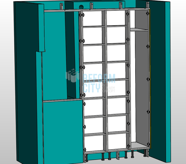 Боковые панели шкафа – 16 мм МДФ, с окрашиванием в матовую эмаль по каталогу NCS S3010-Y10R.