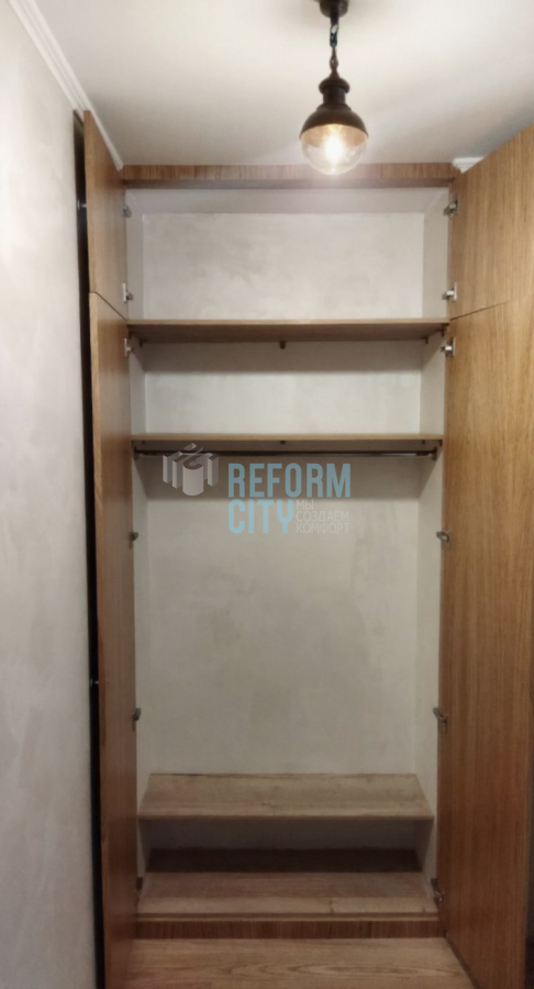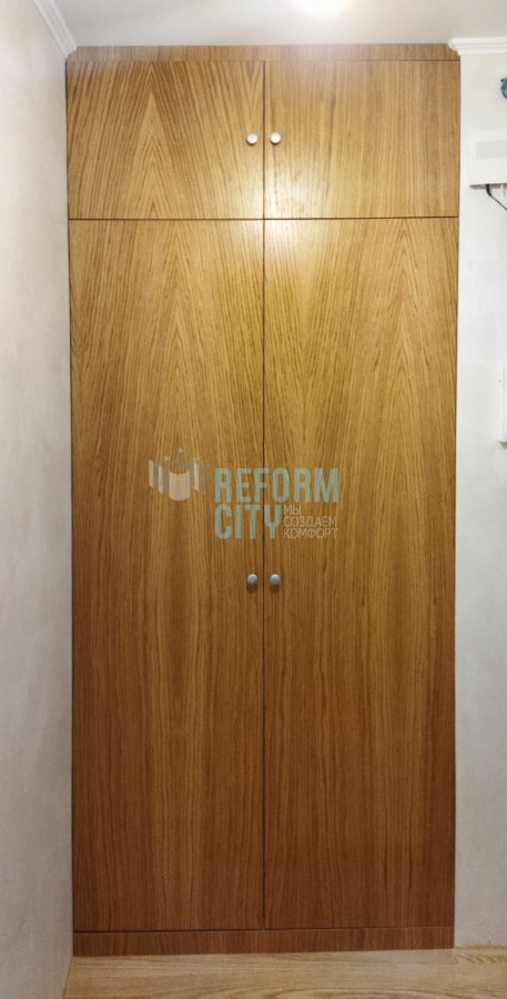 Фасады шкафа и фасады антресолей – 17 мм МДФ фанерованные шпоном дуба тон 7 под матовым лаком с двух сторон.