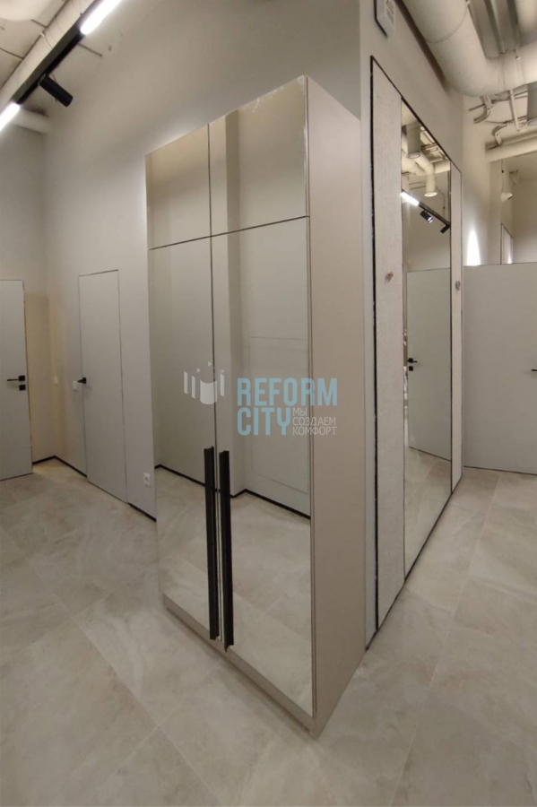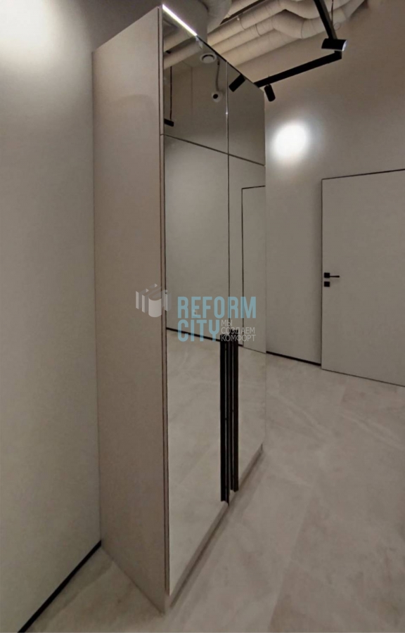 Этот зеркальный шкаф — пример того, как современный дизайн может быть одновременно функциональным и утонченным. Строгие линии, высокие фасады и лаконичные черные ручки создают ощущение стиля и гармонии. Зеркальные поверхности визуально увеличивают пространство и наполняют комнату светом, делая интерьер более просторным и лёгким.