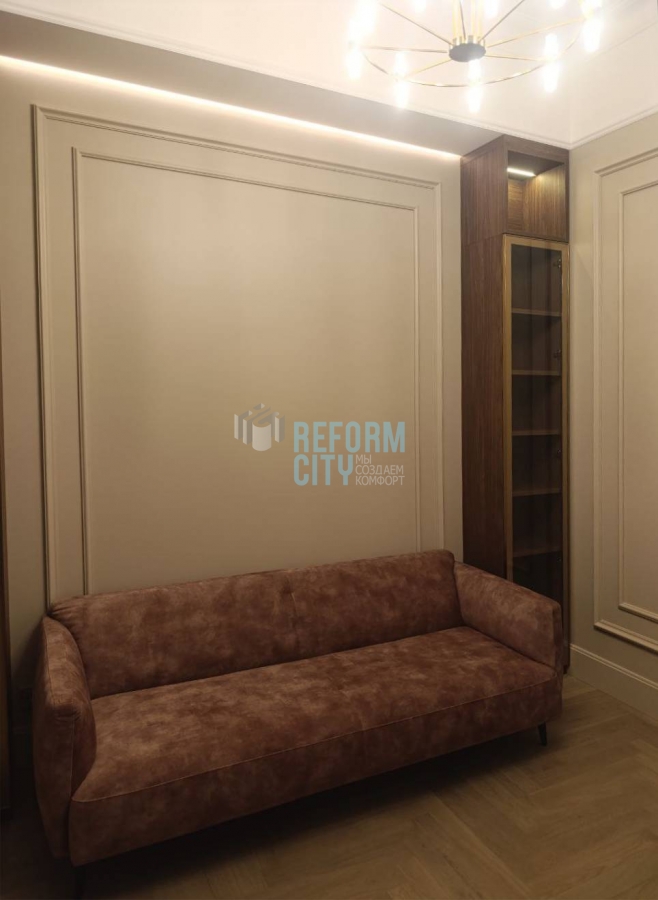 Древесная текстура поддерживает теплую палитру гостиной. Тонированное стекло придает глубину, а теплая подсветка превращает полку в аккуратную экспозицию.
