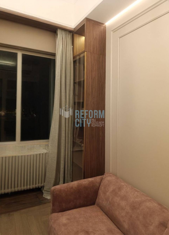 С правой стороны правого шкафа предусмотрен добор из МДФ 19 мм окрашенный эмаль по каталогу NCS - S2005 - Y50R с финишным покрытием матовый лак.